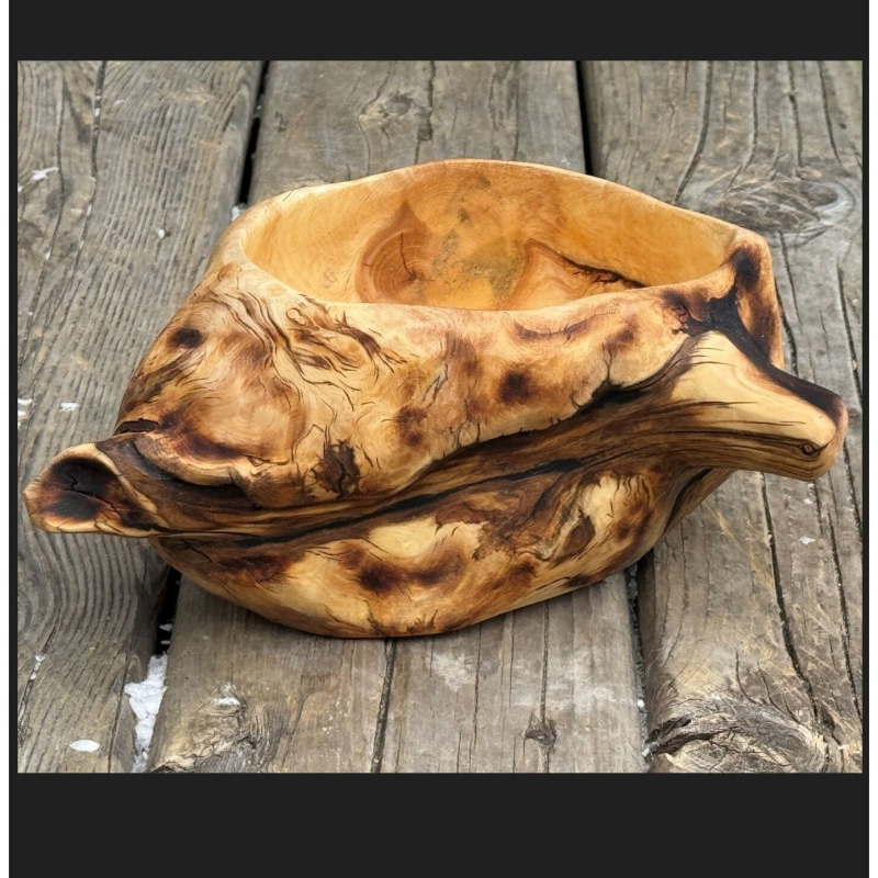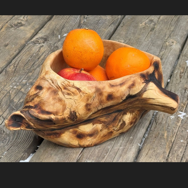 The burl was charred on the outside—burned, cracked, rough to the touch. But under the surface, the grain was alive with texture and color. The marks of the fire weren’t erased, just softened. Signs of that scorched surface are still there, a reminder of where it came from.