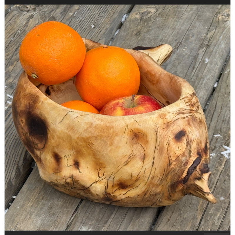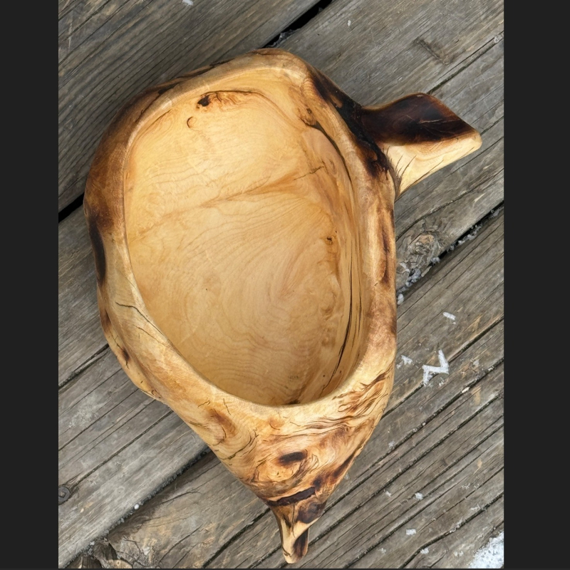 Firekeeper was shaped from a burl touched by forest fire, found near Fox Lake, where the forest still carries signs of what it’s lived through. Years ago, flames moved through that stretch of land, leaving blackened trunks and open space behind. Some trees held on. Others didn’t. What remained was quiet and charred.