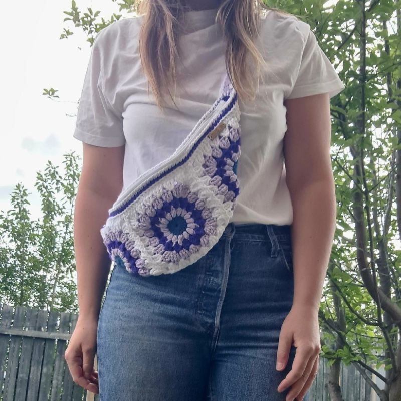 Add a touch of handmade charm to your everyday style with this beautifully crafted crochet fanny pack. Measuring approximately 17 inches (43 cm) wide, it offers ample space for your essentials while maintaining a stylish, compact profile. The body of the bag features a floral granny square crochet pattern, giving it a unique and sunny aesthetic.