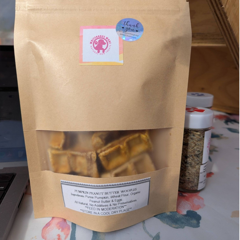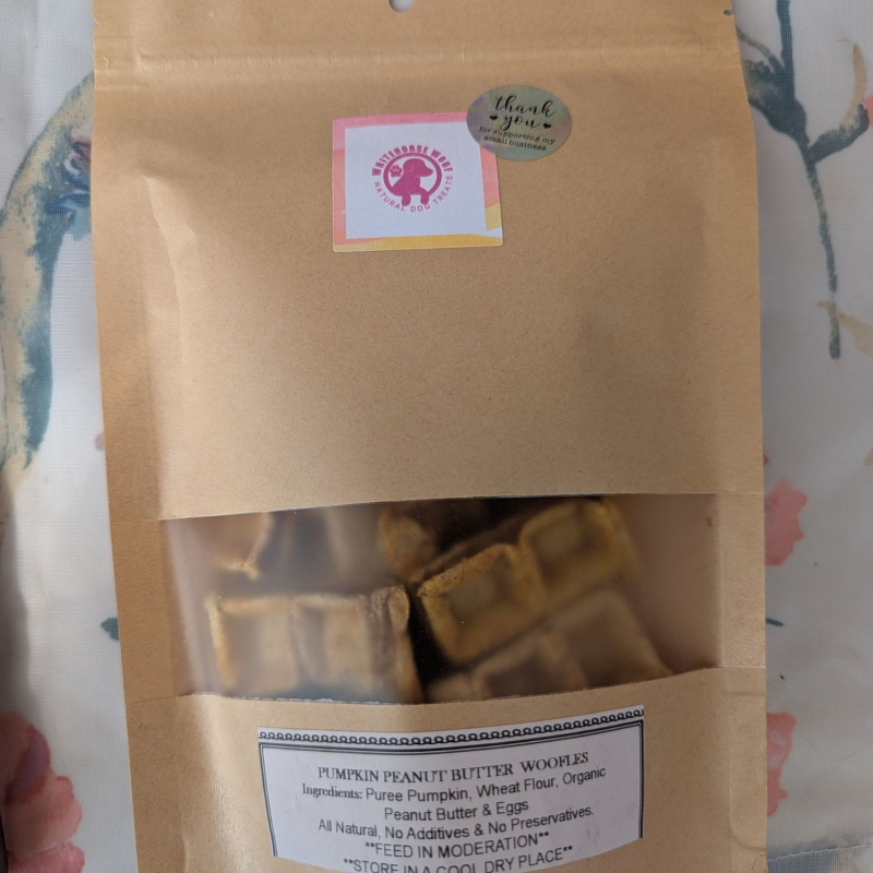 It Includes Puree Pumpkin, Wheat Flour, Organic Peanut Butter and Eggs. The product has all natural ingredients, No additives and No preservatives.
